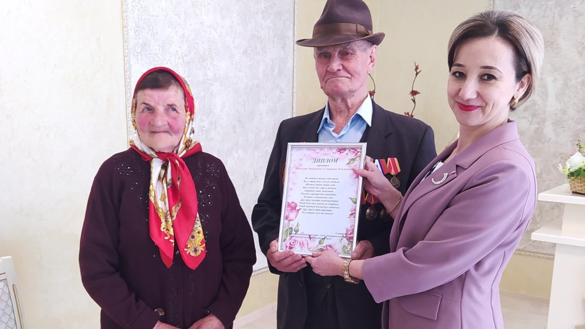 Супружеской паре вручили свадебный диплом со словами о том, что их семейная жизнь для окружающих стала образцом счастливой семьи и любви.
